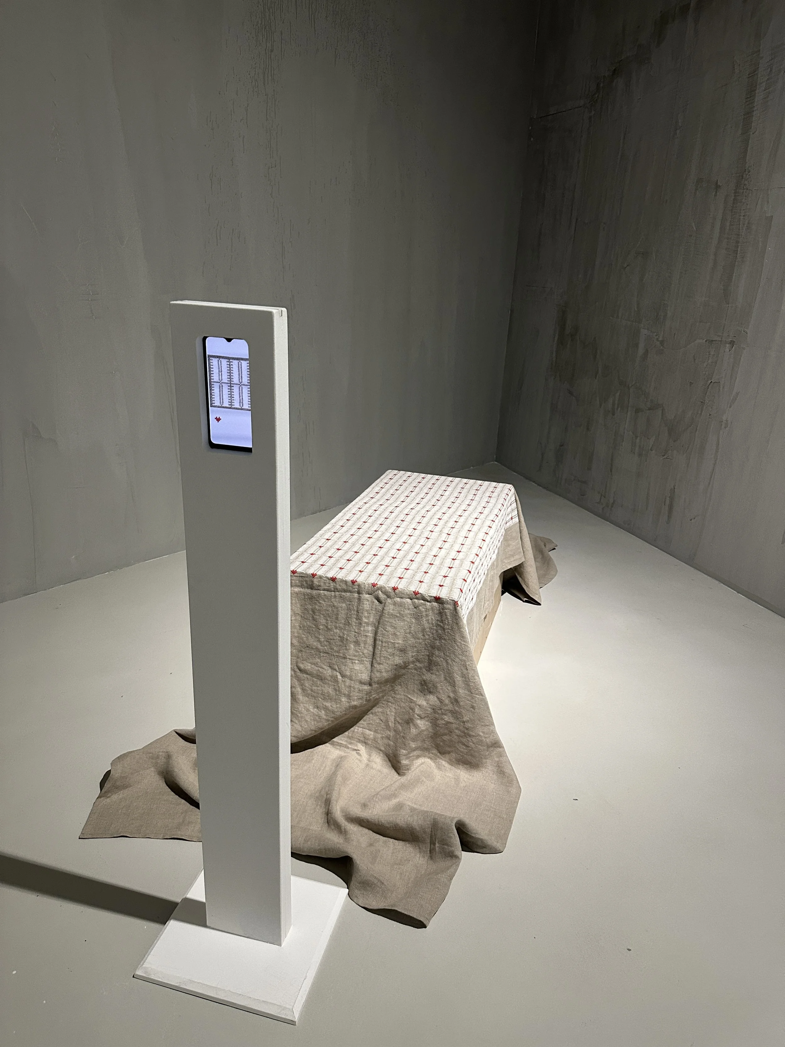 The second part of this work is a pattern of a Like Heart motif embedded in the traditional Graves motif, hand embroidered on linen and made in collaboration with the Inaash Association’s embroiderers. Creating the Like Heart, modeled after Meta’s ‘like’ heart on Instagram, is an example of the dynamic nature and evolution of motif language. Reflecting on the repetitive nature of scrolling and liking on social media, this artwork highlights how these addictive actions affect our internal and external worlds. Though the piece focuses on how the act of ‘liking’ these painful images is out of alignment with what we feel, one can also reframe it to see the repetition of hearts in this work as a way to encourage compassion and empathy. Integrating and repeating the heart motif in the traditional Graves motif pattern is a reminder to be intentional and conscious when we witness the genocide of Palestinians in Gaza through the little screens glued to our hands.